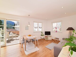 Dalla cucina-soggiorno hai accesso diretto a un terrazzo sul tetto con una vista mozzafiato sulle montagne e sugli edifici storici circostanti.